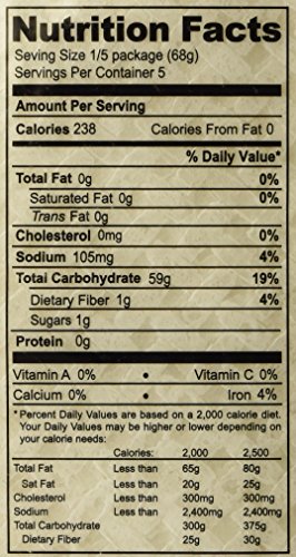 - Per Serving :238 calories, calories from fat :0 , Cholesterol: 0%, Sodium:4%, Dietary Fiber: 4%, sugar:1%, Iron:4%