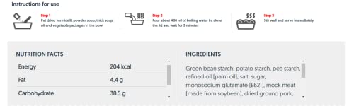 Details: INGREDIENTS Green bean starch, potato starch, pea starch, refined oil (palm oil), salt, sugar, monosodium glutamate (E621), mock meat (made from soybean), dried ground pork, dried onion, pork, spices (garlic, pepper, chilli), fried onion, dried scallions, Disodium 5" - inosinate disodium 5" - guanilate (E631, E627), egg powder, caramel powder (E150d), Disodium succinate (E364ii), citric acid (E330), antioxidants (E320, E321).