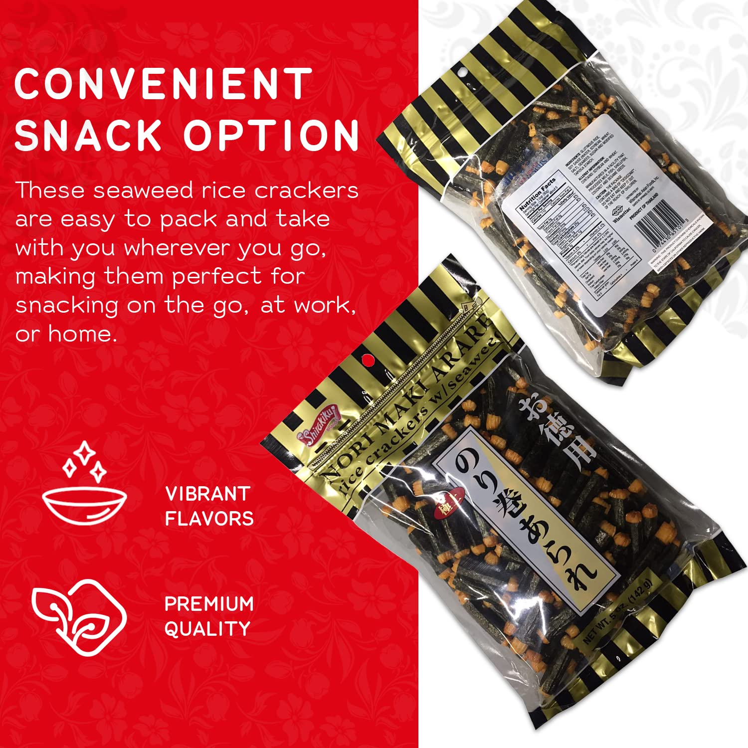 Details: Shirakiku japanese rice crackers with Seaweed is a tasty, healthy snack option. These rice crackers are made using a combination of crisp rice and savory seaweed. They are high in fiber and low in fat, making them a perfect snack for a delicious and nutritious treat. 𝐃𝐞𝐥𝐢𝐜𝐢𝐨𝐮𝐬 & 𝐍𝐮𝐭𝐫𝐢𝐭𝐢𝐨𝐮𝐬 𝐂𝐫𝐚𝐜𝐤𝐞𝐫𝐬 We only use the best possible ingredients to make this japanese snack, including glutinous rice, soy sauce, seaweed, sugar, and modified tapioca starch. The premium ingredients used ensure that every cracker is of the highest quality and packed with nutrients. Moreover, These nori maki arares are a great source of essential vitamins and minerals, making them a perfect snack choice for people of all ages. 𝐂𝐨𝐧𝐯𝐞𝐧𝐢𝐞𝐧𝐭 𝐒𝐧𝐚𝐜𝐤 𝐎𝐩𝐭𝐢𝐨𝐧 Not only are these nori maki rice crackers delicious and nutritious, but they are also a convenient snacking solution. Moreover, these seaweed rice crackers are easy to pack and take with you wherever you go, making them perfect for snacking on the go, at work, or home. 𝐏𝐞𝐫𝐟𝐞𝐜𝐭 𝐅𝐨𝐫 𝐃𝐢𝐟𝐟𝐞𝐫𝐞𝐧𝐭 𝐎𝐜𝐜𝐚𝐬𝐢𝐨𝐧𝐬 These japanese snacks are also an excellent choice for any occasion. They are a unique and tasty addition to any snack spread and will surely be a hit with your guests. So why wait? Try these delicious japanese seaweed snacks with Seaweed today and see why they are a favorite. You won't be disappointed!