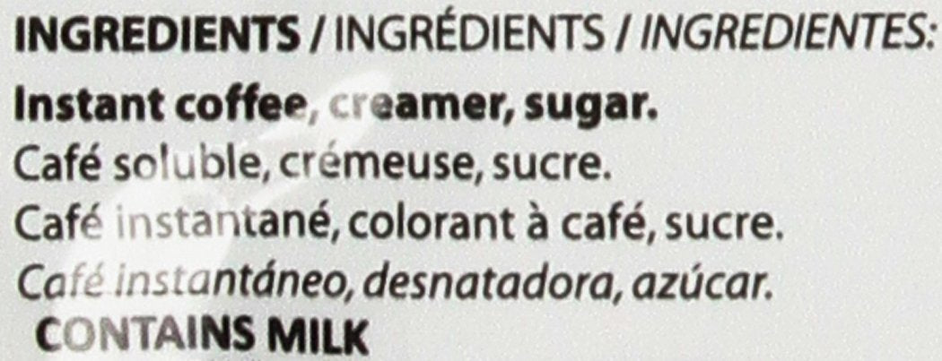 • Ingredients list: sugar, non-dairy creamer (gluicose syrup, hydrogenated vegetable oil (palm kernel and/or coconut oil), milk protein, emulsifiers: mono- and di-glycerides of fatty acids (471), diacetyl tartaric and fatty acid esters of glycerol (472e), sodium stearoyl lactylate (481i), stabilizers: dipotassium orthophosphate (640ii), sodium polyphosphase (452i), sodium tripolyphosphase (451i), salt, anticaking agent silicon dioxide amorphous (551), artificial color beta-carotene (160ai), instant coffee 14%)
